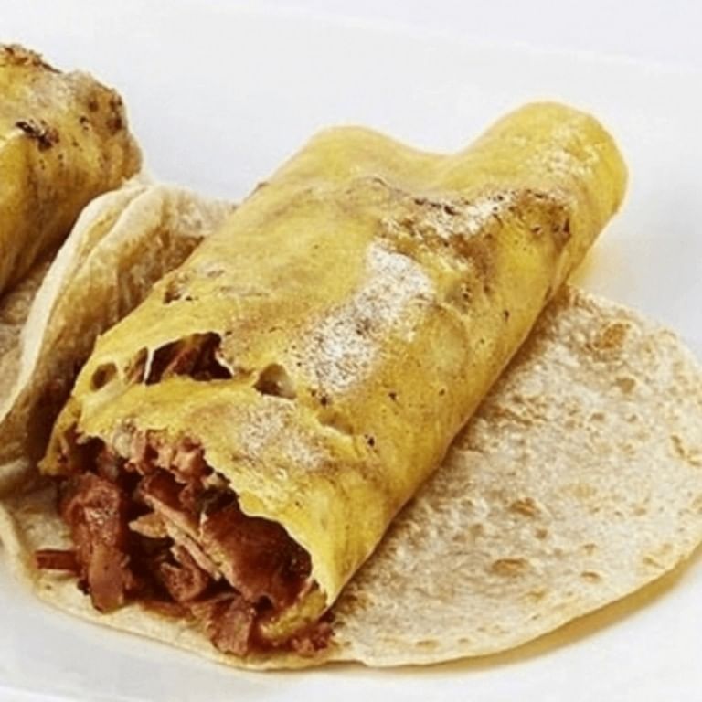 12 inch flour tortilla filled with rice, beans, choice of meat, fresh onions/cilantro, rolled up and pan toasted, then to top it off we roll it into a crispy cheese costra/scab