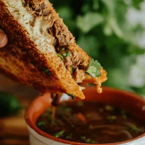 Texas toast filled with melted chihuahua cheese, birria and served side of consomé and our fries. Not your typical grilled cheese!!